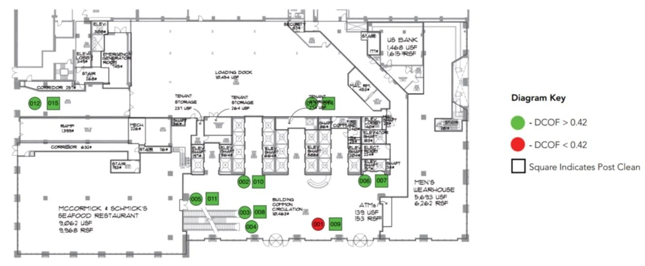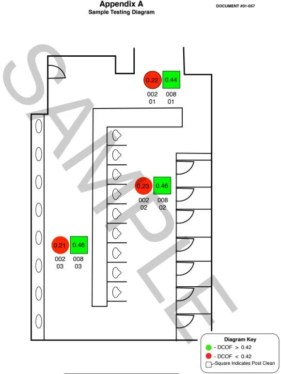 Our reports are prepared in accordance with ASTM F1694-14, “Standard Guide For Composing Walkway Surface Investigation, Evaluation, and Incident Report Forms for Slips, Stumbles, Trips, and Falls,” and the ASTM F2048-00, “Standard Practice for Reporting Slip Resistance Test Results.” The data contained within the report is intended to provide factual information concerning the American National Standard Method For Measuring Dynamic Coefficient Of Friction Of Hard Surface Flooring Materials, ANSI A326.3-2021 Standard.